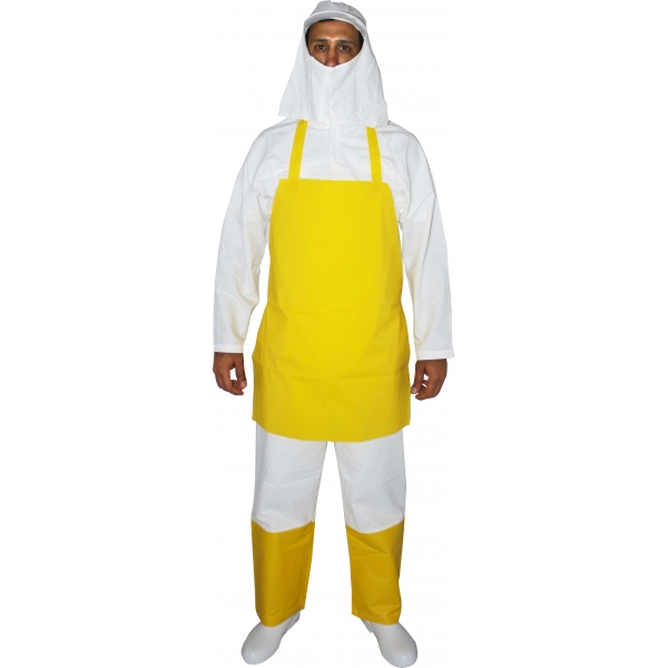 Vestimenta de segurança tipo corpo inteiro, confeccionada em tecido misto de algodão e poliéster com tratamento hidrorrepelente. A vestimenta é composta de camisa com mangas longas até os punhos, gola alta com velcro afixado na parte frontal abaixo do pescoço para fechamento da abertura, tiras de tecido embanhados na cintura para ajuste, capuz com aba tipo boné revestida de tecido hidrorrepelente e pala com fechamento frontal por velcro; calça tipo reta comprida até os pés, com reforço em material de PVC impermeável a partir da parte mediana das coxas, cordão de tecido embanhado na cintura da calça para ajustes. Boné com aba rígida plástica em acetato transparente.